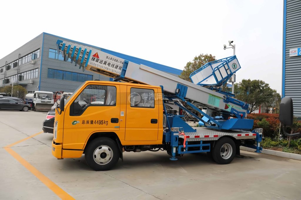 | Application Scope | This vehicle is also called an aerial work platform truck. It is mainly used for engineering leasing, curtain wall construction, roof waterproofing, solar installation, advertising light boxes, power maintenance, air conditioning installation, cleaning companies, cement and gravel transportation, bridge maintenance, road and bridge maintenance, etc. The maximum load capacity of the platform is 400kg. |